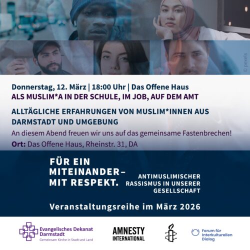 Die aktuelle Veranstaltungsreihe widmet sich dem Thema an drei Abenden sowie in einer begleitenden Filmreihe – mit Informationen, Diskussionen und Perspektiven für solidarisches Handeln. Sie ist eine Kooperation des Ev. Dekanats Darmstadt mit Amnesty International Bezirk Darmstadt und findet im Rahmen der Internationalen Wochen gegen Rassismus der Stiftung gegen Rassismus statt.