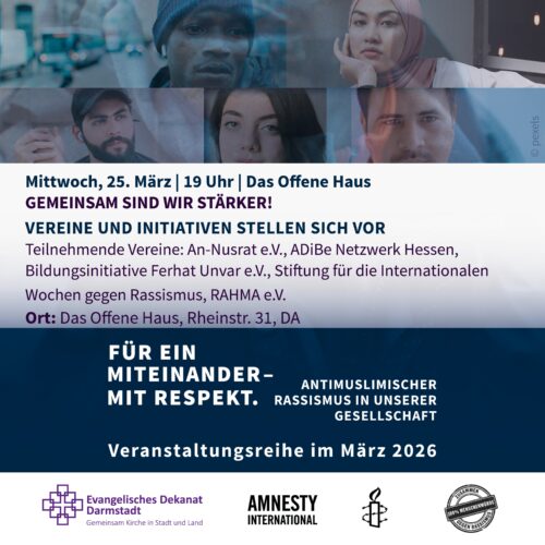 Die aktuelle Veranstaltungsreihe widmet sich dem Thema an drei Abenden sowie in einer begleitenden Filmreihe – mit Informationen, Diskussionen und Perspektiven für solidarisches Handeln. Sie ist eine Kooperation des Ev. Dekanats Darmstadt mit Amnesty International Bezirk Darmstadt und findet im Rahmen der Internationalen Wochen gegen Rassismus der Stiftung gegen Rassismus